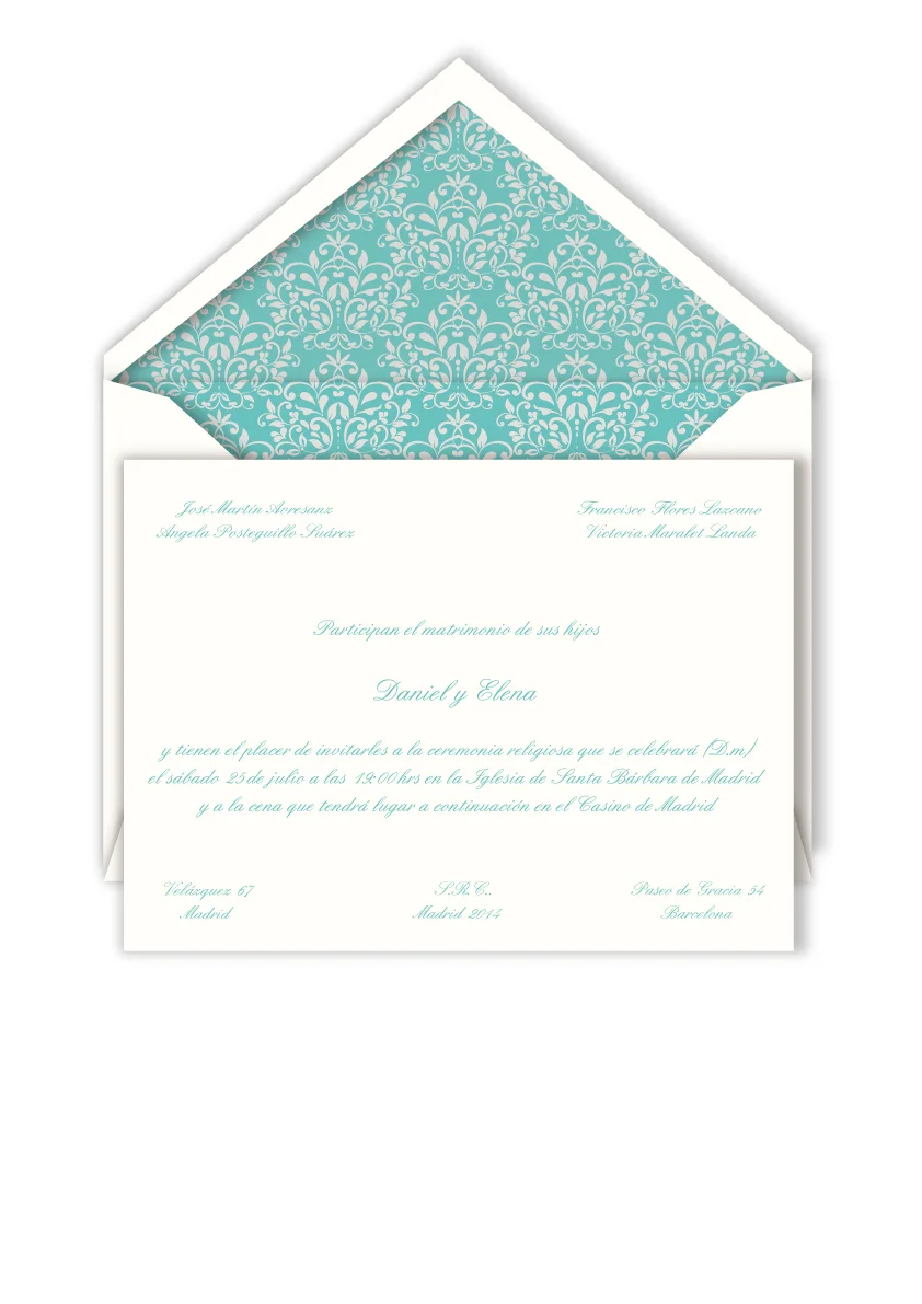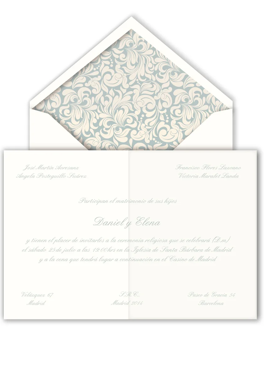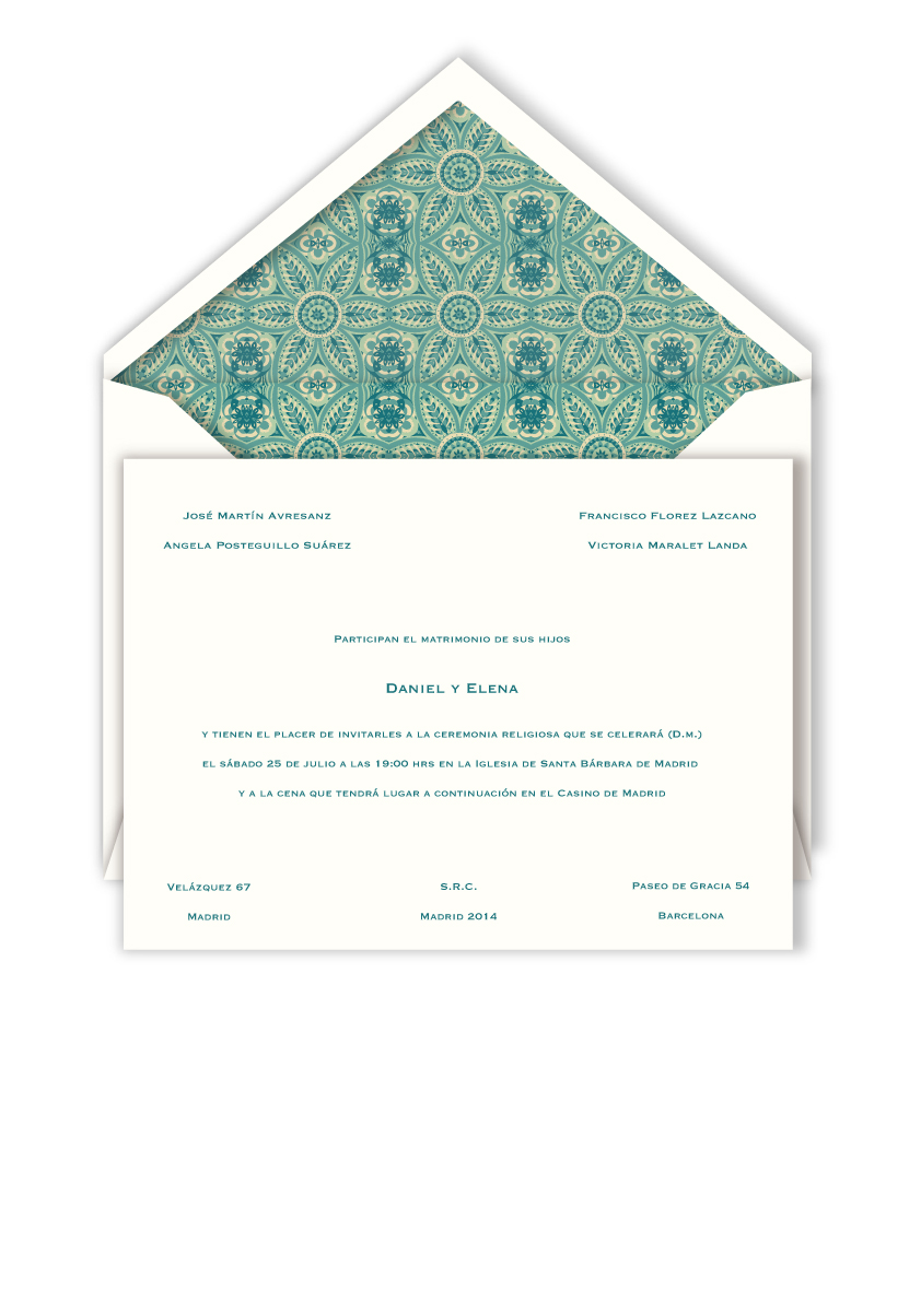 Sobre: 16,8 x 22 cm verjurado color marfil, verde, azul cobalto o arena